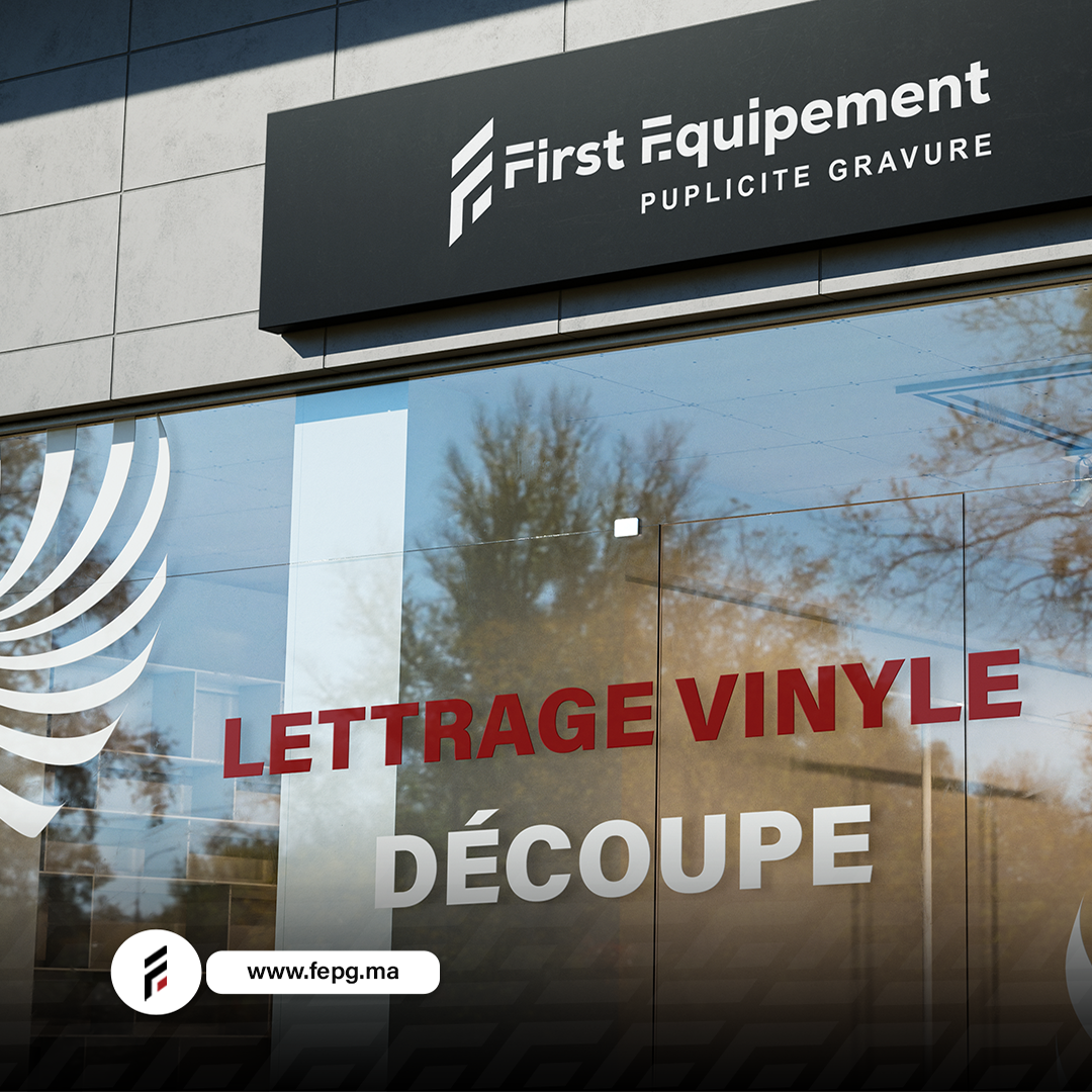 First Equipement Gravure Impression à Casablanca réalise du lettrage vinyle sur mesure pour vitrines, véhicules et enseignes, avec une finition durable.